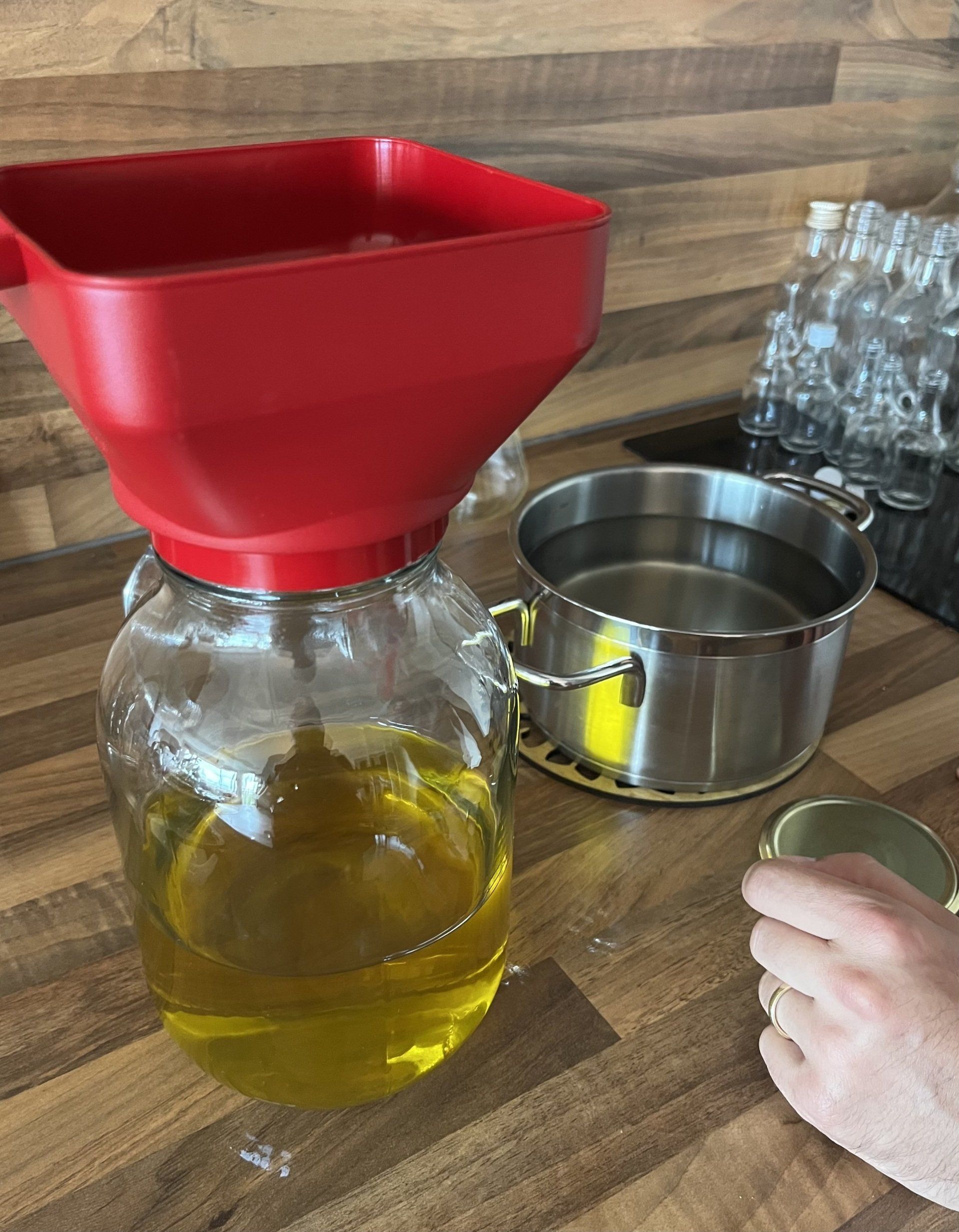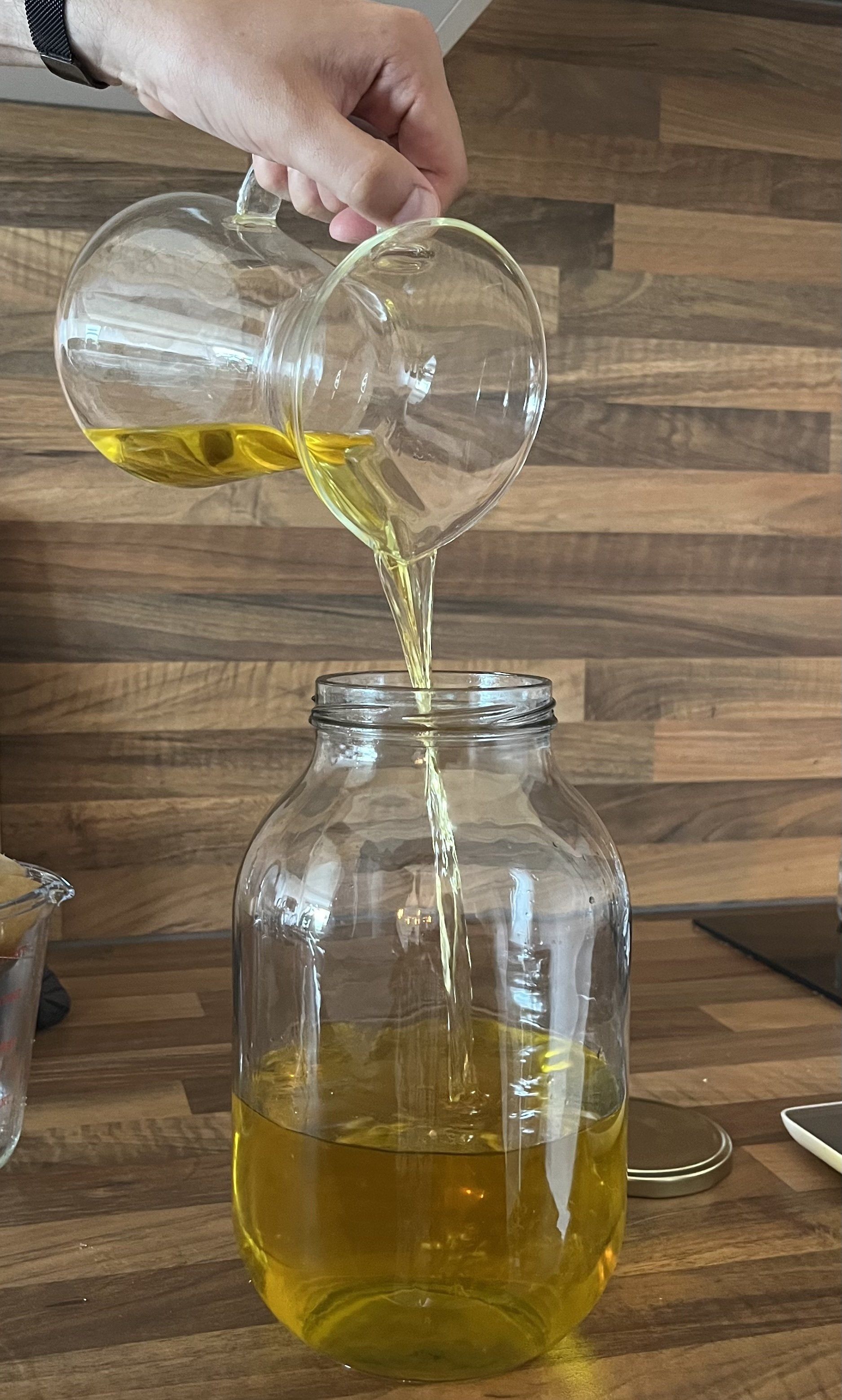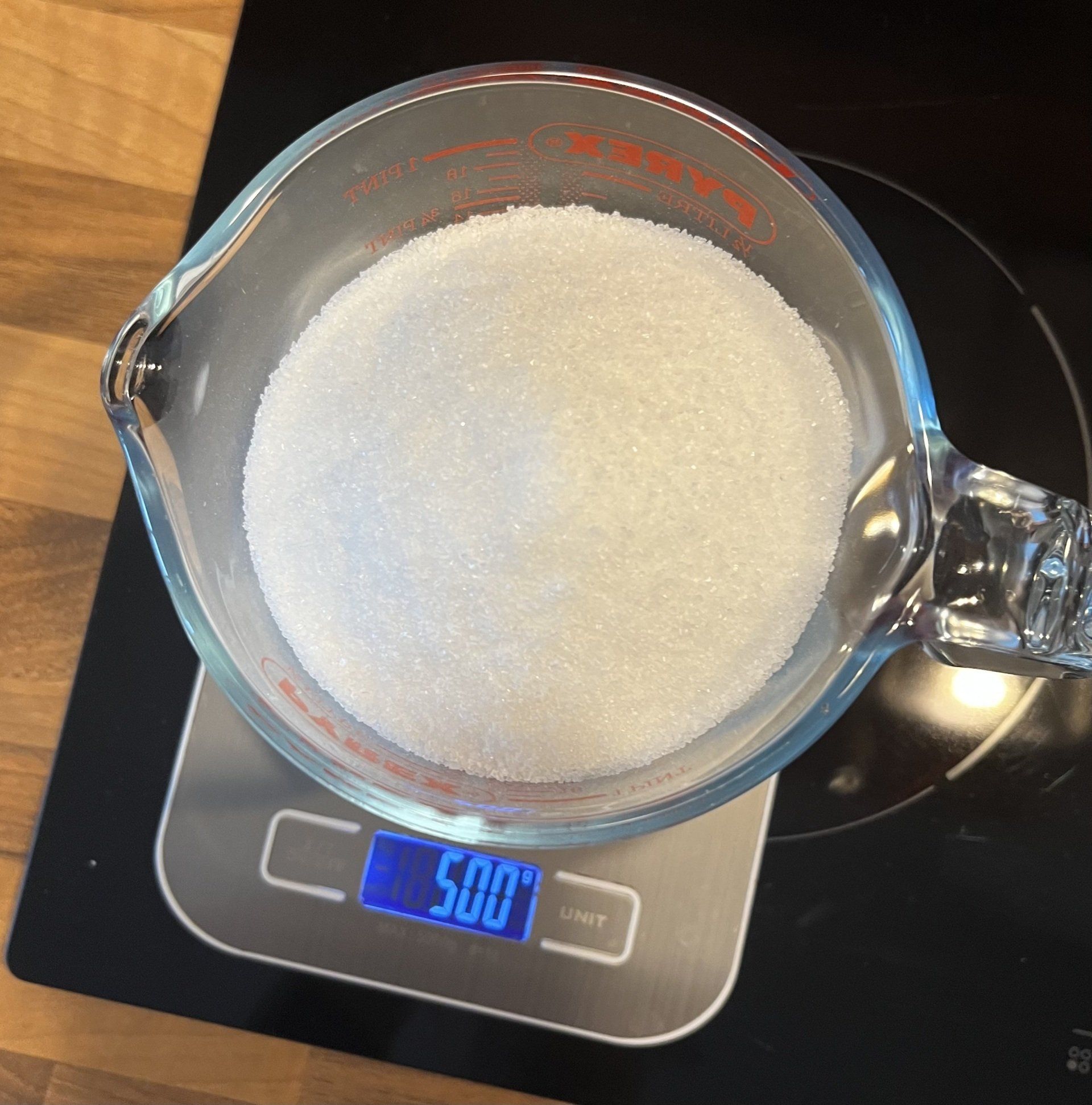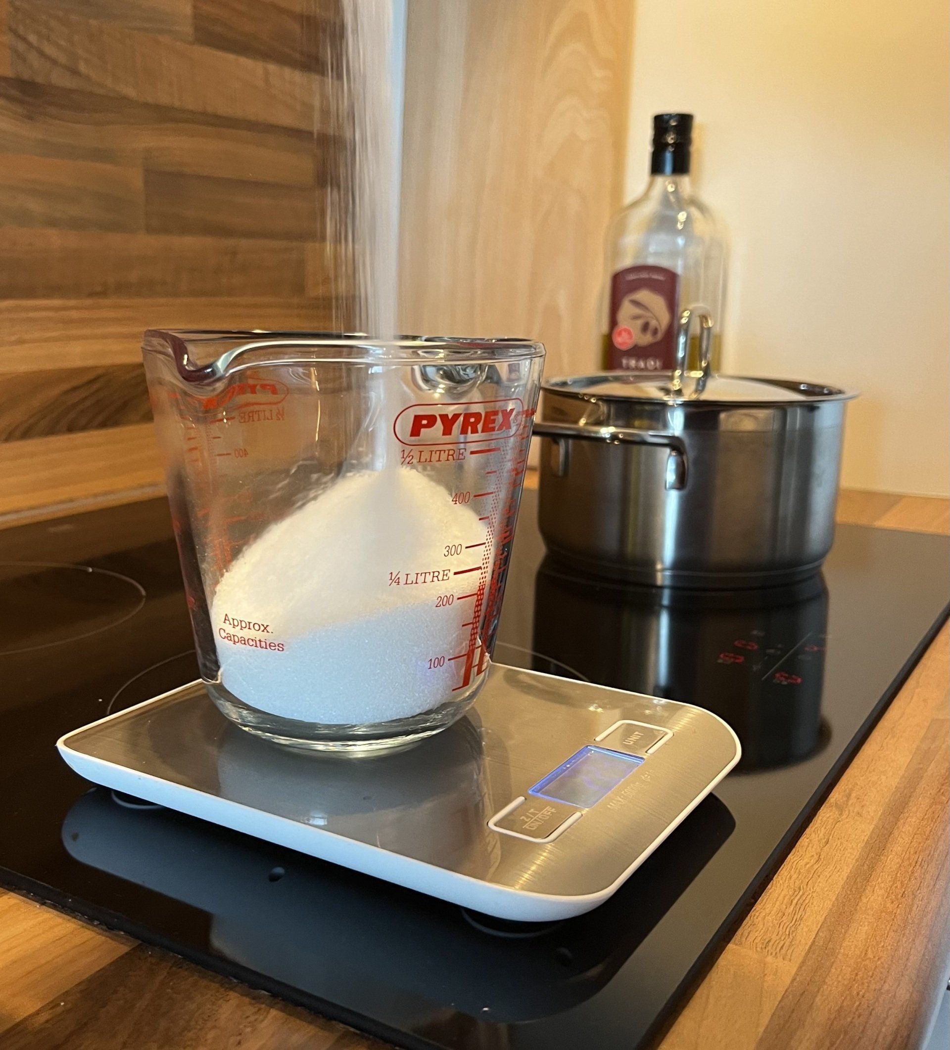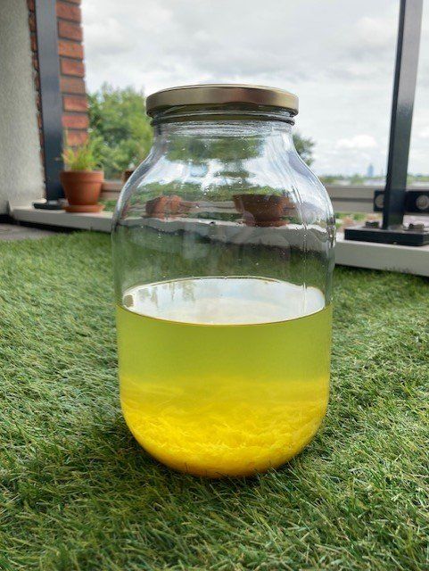4. Na ongeveer een maand (mag ook iets langer of korter zijn) kook je 1 liter water en los je hier 500 gram suiker in op. Laat dit suikerwater vervolgens afkoelen.