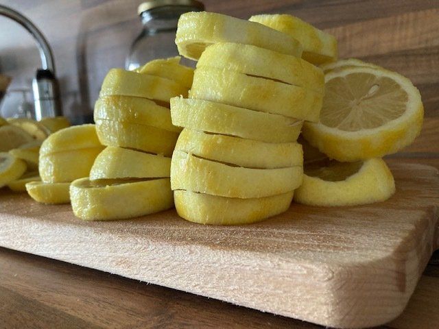 3. Voeg de citroenschillen en de alcohol samen in onze 3 liter pot. Laat deze vervolgens 1 maand staan op een donkere plaats en schudt deze een paar keer per week even krachtig heen en weer. Tip: gooi de rest van de citroenen niet weg, maar vries deze in schijfjes in om ze op een later moment toe te voegen aan een heerlijk koel drankje!